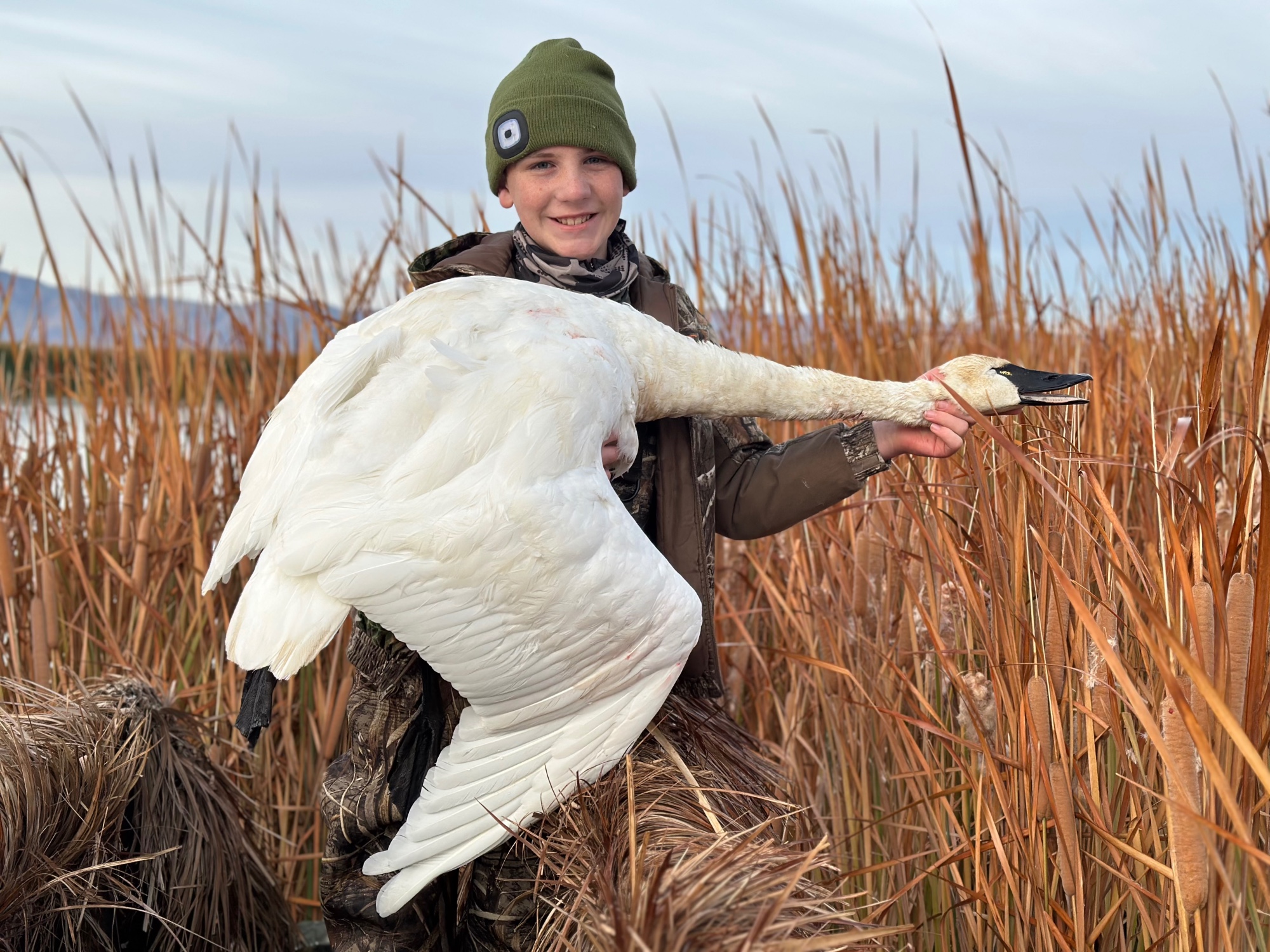 Easton Doxey had a great week starting by tagging his first buck his fist year hunting deer. He ended it by making a great shot on this beautiful mature swan. He had some opportunities earlier that morning but had some issues with getting the safety off. He also choose to hold off on shooting a juvenile swan in the decoys because he wanted a mature bird. This one decoyed in just how we wanted.
