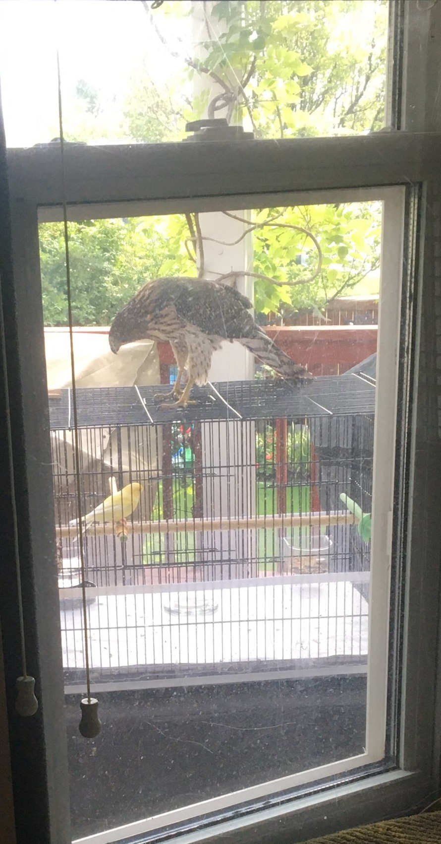 I put my canaries out on our covered deck just in front of our kitchen window so they could get a little fresh air. This hawk thought they looked delicious.