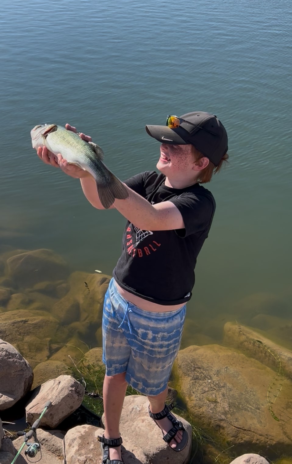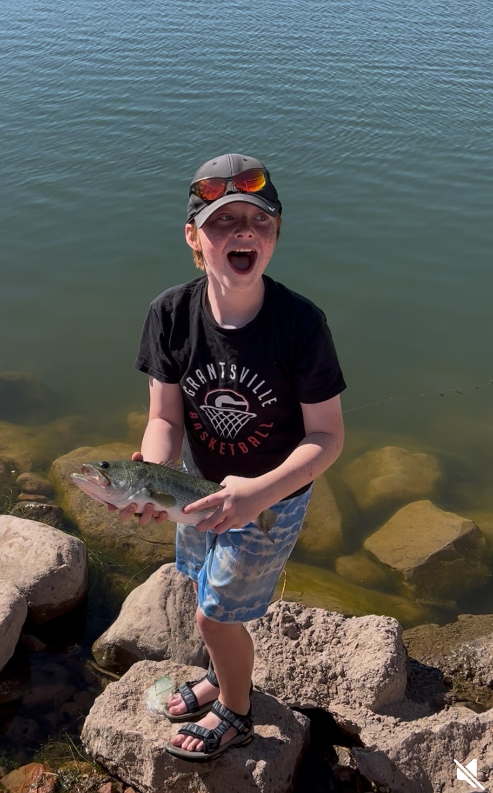 My grandson, Hayden Merrill, and I were visiting Saint George last weekend, and wanted to go fishing, so we headed to Ivin Reservoir for the first time. Hayden saw some bluegill in the rocks near shore, and rigged up a hand line with a small hook, with a ball of bread on it, and was having a great time trying to catch the bluegill, when this formidable largemouth emerged from the deeper water, and took his bread ball! He successfully pulled it to the shore using his hand line, he was both thrilled and surprised as he proudly showed his first ever largemouth bass to those nearby, prior to releasing it back into the water.