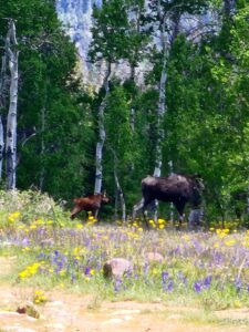 Momma moose and newer baby up suicide park road on the utah side of the utah Wyoming boarder