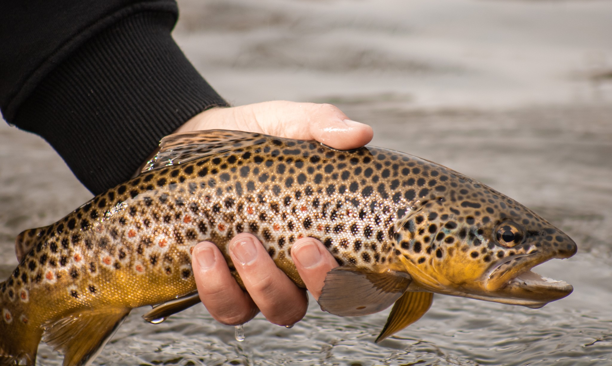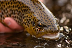 Caught this spot filled brown trout early on the Middle Provo River off a hand made marabou jig I tied myself. I love the red spots and the hint of blue on the side of his head. Gorgeous hard fighting fish!