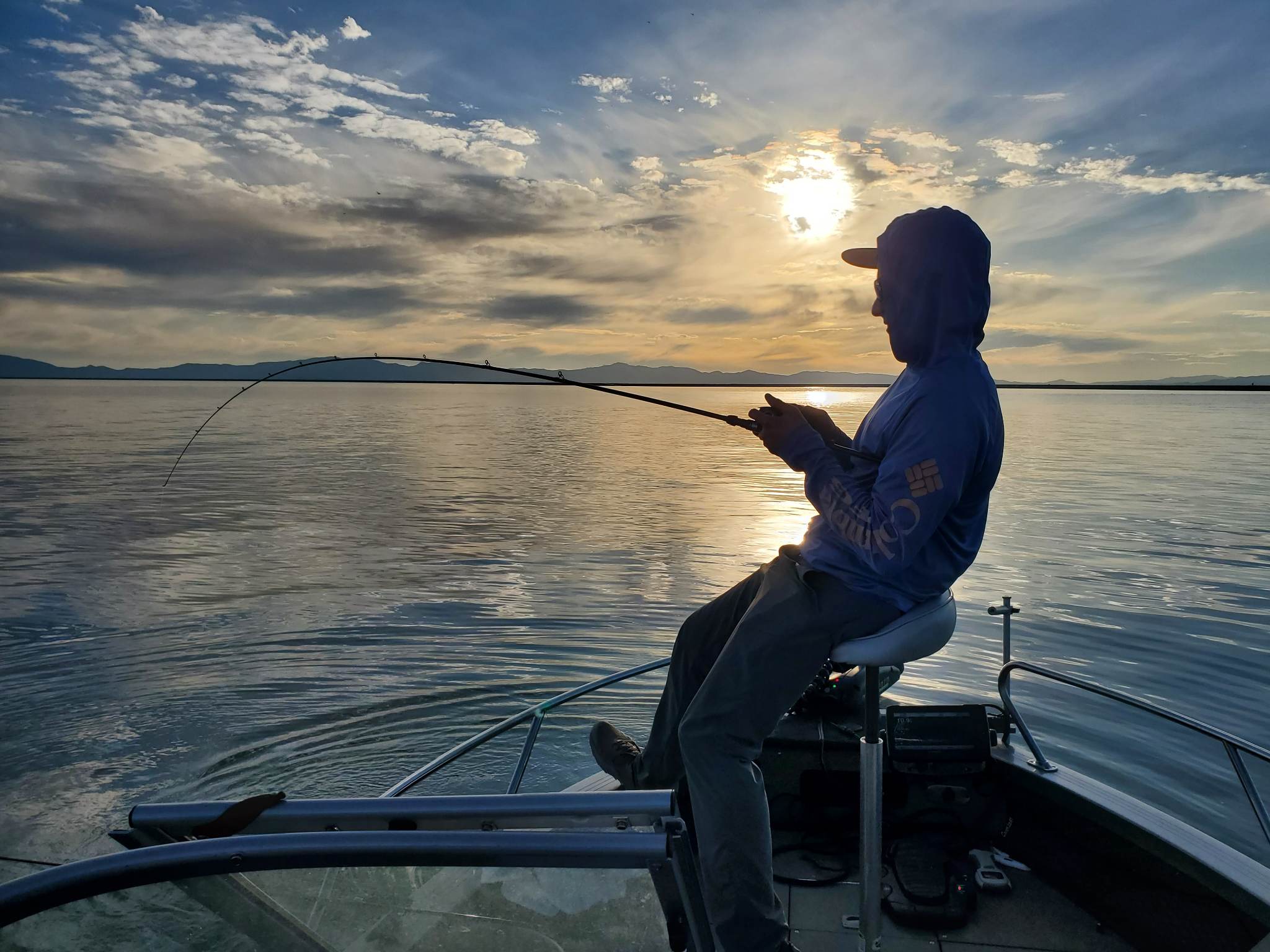 I am a school teacher, and every year I take a month off to visit my kids and tow my boat across the West. This year, I had the opportunity to meet up with my son, who lives in Utah, and we decided to spend a few unforgettable days at Willard Bay. We had a couple of amazing days chasing wipers and catching multiple fish including a 5lb 14oz specimen caught by my son and a 5lber caught by myself. Just before sunset, I this incredible snapped a picture of my son hooked up to another big whiper on the longest day of the year.