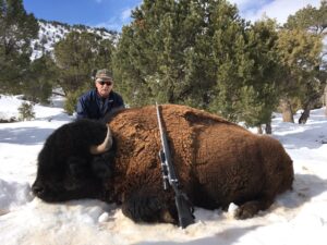 Fred hunted and shot this buffalo on a private ranch in Tabiona, Utah this April. He can cross buffalo off his bucket-list of North American Big Game now, and the meat is delicious!