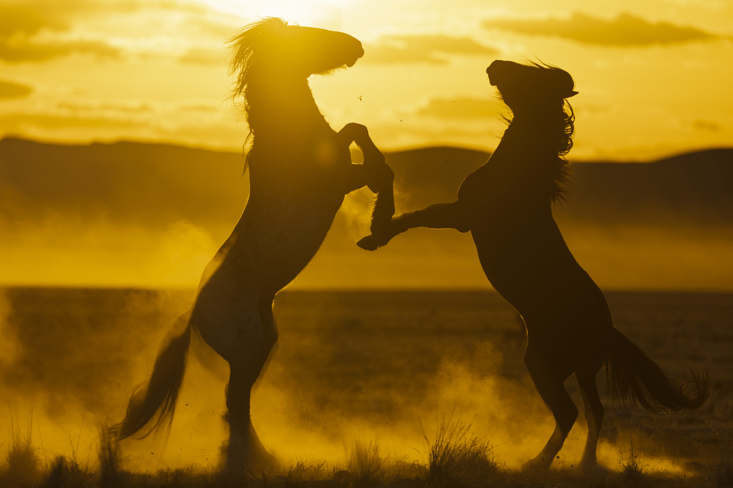 Two wild mustangs battle for dominance or maybe just a little sunset play in the West Desert of Utah. The light turns magical as the sun drops to the horizon and the dust is kicked up by horse play.