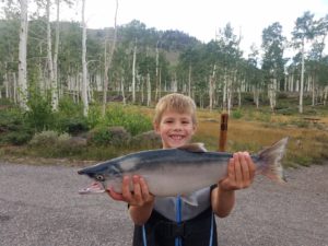 Fish Lake, August 2022. 7 year old John caught this nearly 4 lb. salmon off of grandpa’s sinker boat (nick named “sinker”). Big fish, big grin.