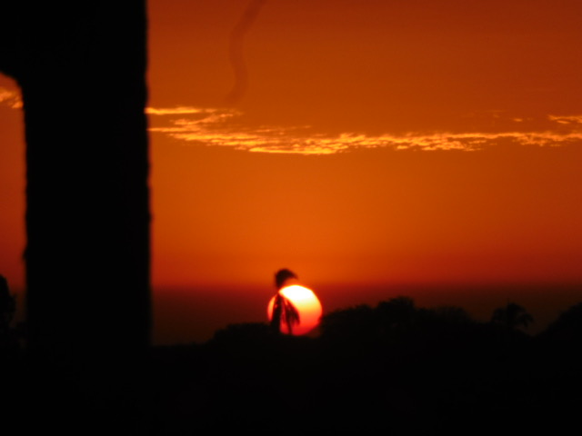 Morning sunrise over Electric Lake, with dark clouds rolling in and the horizon glowing red and orange behind the pines.