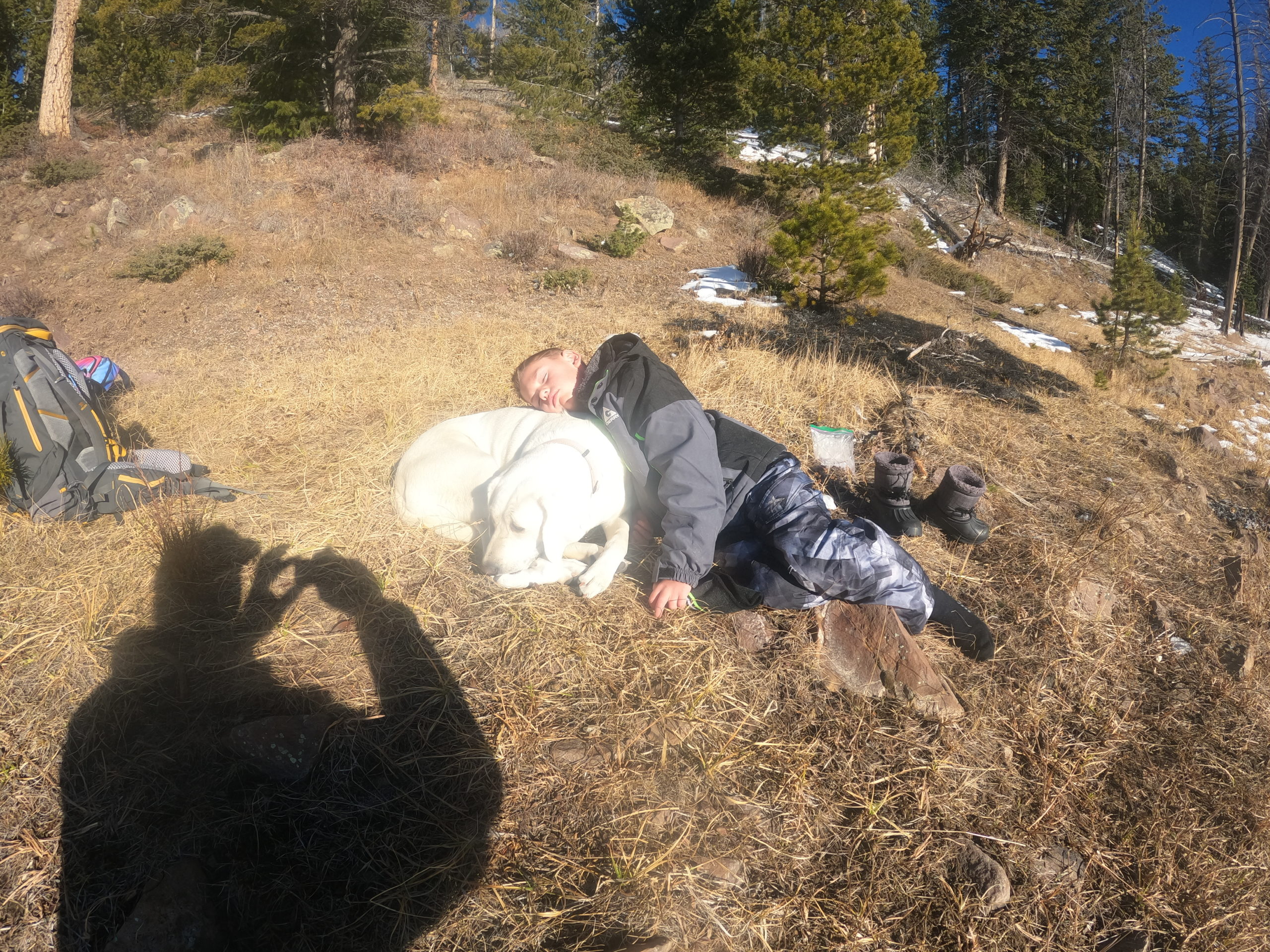 This was our first hardwater trip of the Fall Season and we wanted some tasty Brook Trout to eat. Sister and Brother, Jenna Seeley (age 11) and Cole Seeley (age 8) were having a great time ice fishing with their Dad and their family pet, which is a white Labrador Retriever named Scout, until Cole found some thin ice and fell in up to his thighs. The truck was about a mile away, so Dad had to think fast so Cole wouldn’t get too cold. Being ahead of the game, luckily Dad had already built a fire and Mom had sent some extra socks in Cole’s backpack. With some dry socks and and a warm dog to use as a pillow, Cole fell asleep by the fire and Jenna was able to continue her fun day of ice fishing. It pays to be prepare because the day turned out to be a complete success.
