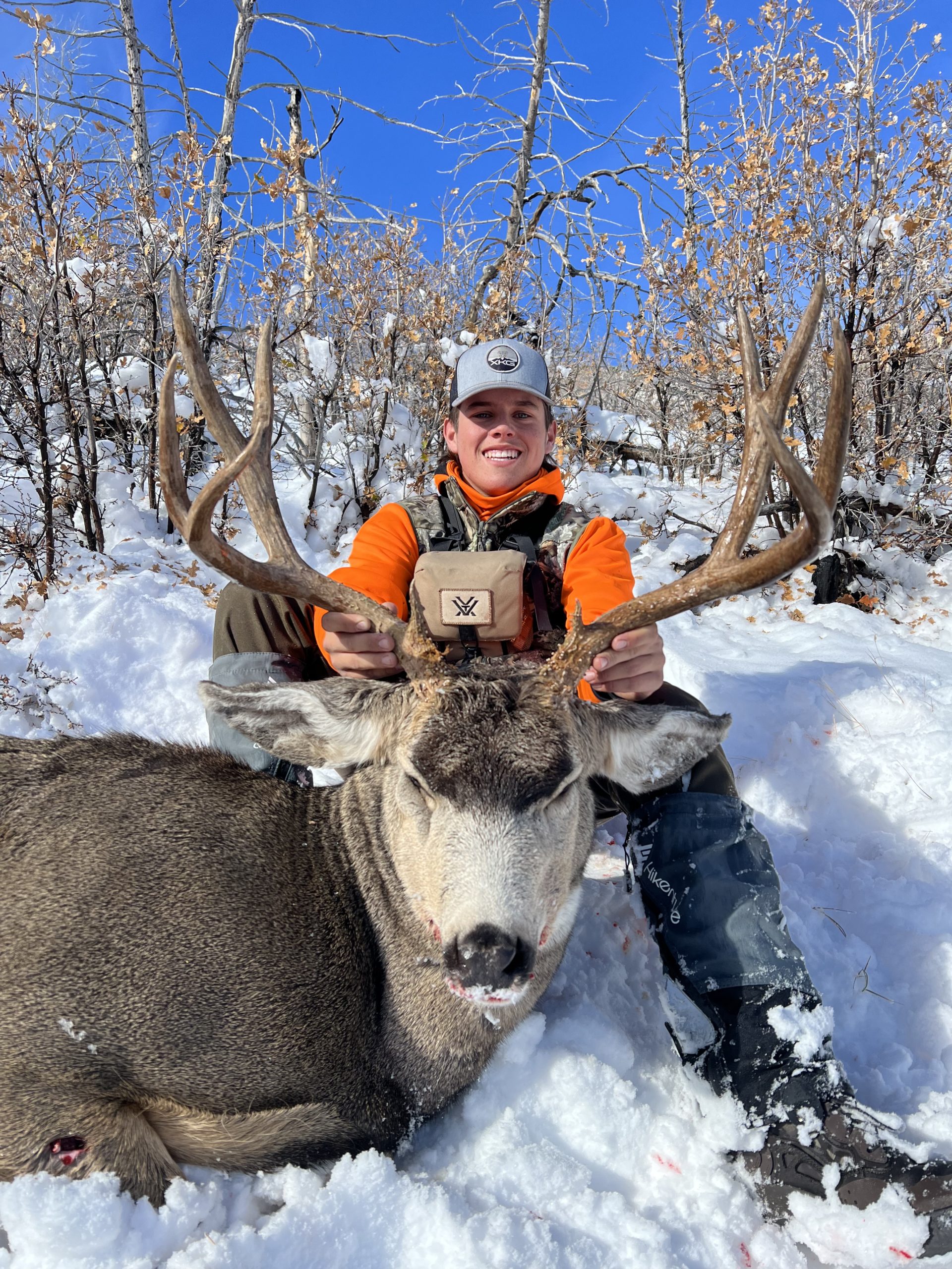 Mule deer hunt 2022 Kasen Walker 16 years old My brother and niece are in the picture on the side by side. After 5 long days hunting in the freezing cold we hit pay dirt on this 170 typical 4 point. We woke up to almost a foot of snow Sunday morning! Later that evening just before dark we seen this buck about a mile away and could only hope to see him in the next few days! Then our hopes came true Tuesday morning as we glassed up this buck in the same pocket we seen him on Sunday! We then made a plan and headed up to where we seen him last. We then snuck down to where we seen him only to find him gone. Then on our way back to the side by side we seen a smaller buck he was with run into some trees. We then moved to a better spot hoping the bigger buck was still with him and then sat in the freezing snow for 20 minutes before the smaller buck walked out of the trees. Then about 2 minutes later my buck walked out at about 200 yards and then we gave him a snow nap. We quartered him and made the pack out, packed up camp, and drove back to town all before football practice later that day. This hunt was unforgettable with all great people we got to meet and all the new things I have learned about these amazing animals. But the best part about this whole hunt was becoming closer to my family and meeting new friends.