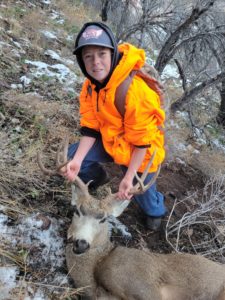 October 29th, after a tuff morning trying to get out on the mountain we made it to the mountain set up to scout for deer, my dad spotted 2 bucks 3 ridges away my dad, mom and I set out a plan to get down to these deer. While dad stayed back keeping a close eye on the deer mom and I started out driving over a ridge then walking out down a very steep oakbrush hill side. My mom and I closed in on the 2 deer 180 yards out so set up and did a 1-2-3 countdown to shoot mom missed but I got this nice 3×5.
