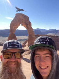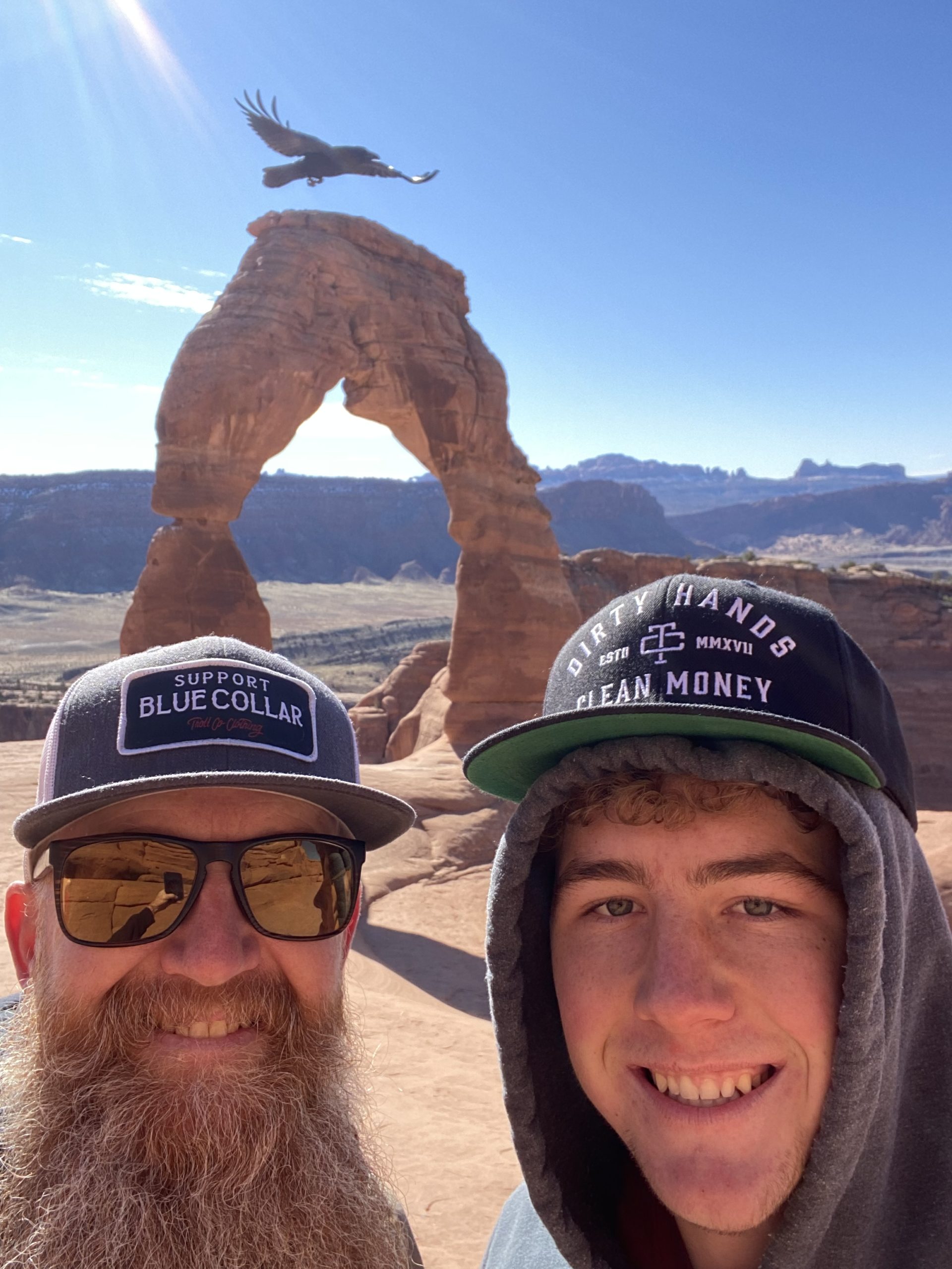 Hiking to delicate arch. Photo with my son when a raven decided to photo bomb us.