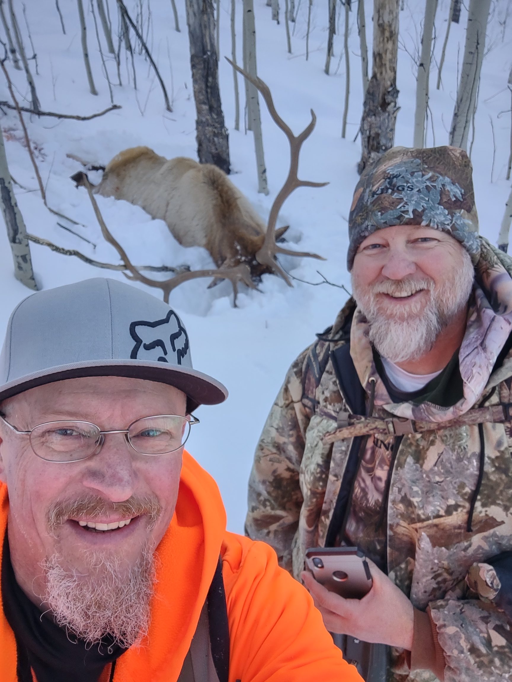 Took 23 years to draw my Limited Entry Elk for late rifle on Boulder. I hired High Top Outfitters to help ensure my success!! With guide Jason Porter, we set up on a bull opening morning that we had seen the day before. He never showed up and we found this bull farther up the canyon. We made a stalk on him and he slipped over the rim. We regrouped, broke out the maps and went after him. We busted trail in the almost 2′ of snow at times and cut his tracks. We figured we’d try to hit some vantage points on the way back to camp on our way back to camp. The first ridge we went out we turned him up bedded in some thick quakies. We made a 700 yard stalk on him. Set up on him multiple times and finally we had a shooting lane through the trees. Threaded the needle with a well placed shot and the rest is history!! Had an amazing experience, got a great bull and made a life long friend in my guide!! Bull taped out at 340″!! I couldn’t be happier!!