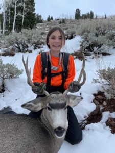 NEVER EVER QUIT – Tara Ivie ( submitted by her dad, Russ Ivie) Tara was on a quest to harvest her first big game animal. She was unsuccessful in Utahs general season draw, so I mentored her with my permit through UDWR’s mentor program. Her excitement mounted. It was just her, her dad, and a buck tag! Weather conditions were not perfect, and at times seemed stacked against the young lady. She endured relentless wind, low temperatures, and deep snow. She never ever quit! On the evening of the fourth day of Utahs general season deer hunt, everything came together for the young huntress. She spotted this fine buck and made a single clean shot to reach her goal. She made her ‘ol mans dream come true. She set her goal and did whatever it took to achieve it. She never ever quit! As Doug Miller use to say, “Look at that big toothy grin!” It is a pleasure for me to take my kids into the woods. I firmly believe that nature never raised a nobody!