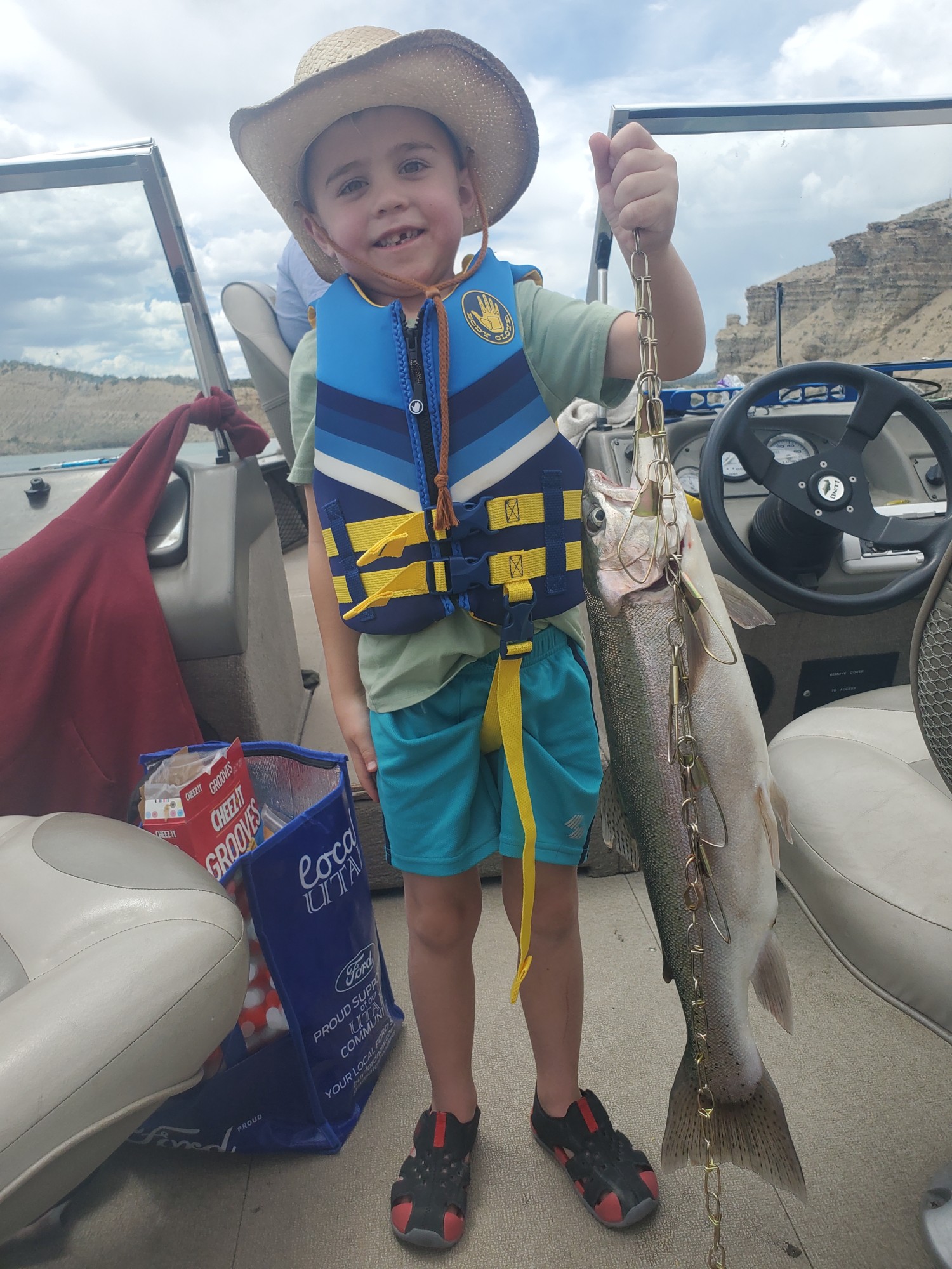 5 year old Liam’s personal best rainbow trout at Starvation Reservoir on Grandpa’s boat.