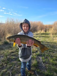 My 11 yr old son (Kayden) caught this 4.5 lb/20″ Tiger Trout in Nevada.