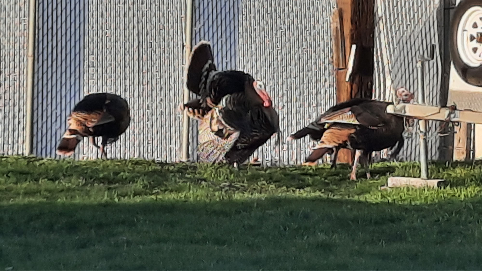 6 Tom turkeys were holding a meeting in front of a neighbor’s home. I had to sneak up on them from across the street keeping the neighbor’s truck between me and them. I call it Turkey Dominance Diplomacy.