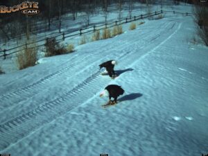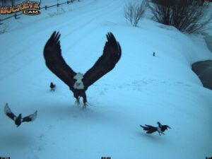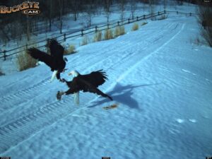 The first picture is the Bald Eagle getting annoyed by magpies while trying to catch a fish in the pond. The second and third pictures are of two mature Bald Eagles fighting after a fish that one had caught and the other one wanted to have his share. These eagles have made a home at our pond in northern Utah by our family cabin. They stay year round,